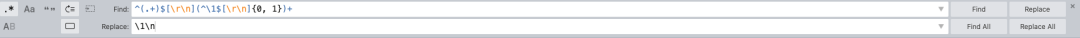 ^(.+)$[\r\n](^\1$[\r\n]{0, 1})+替换为