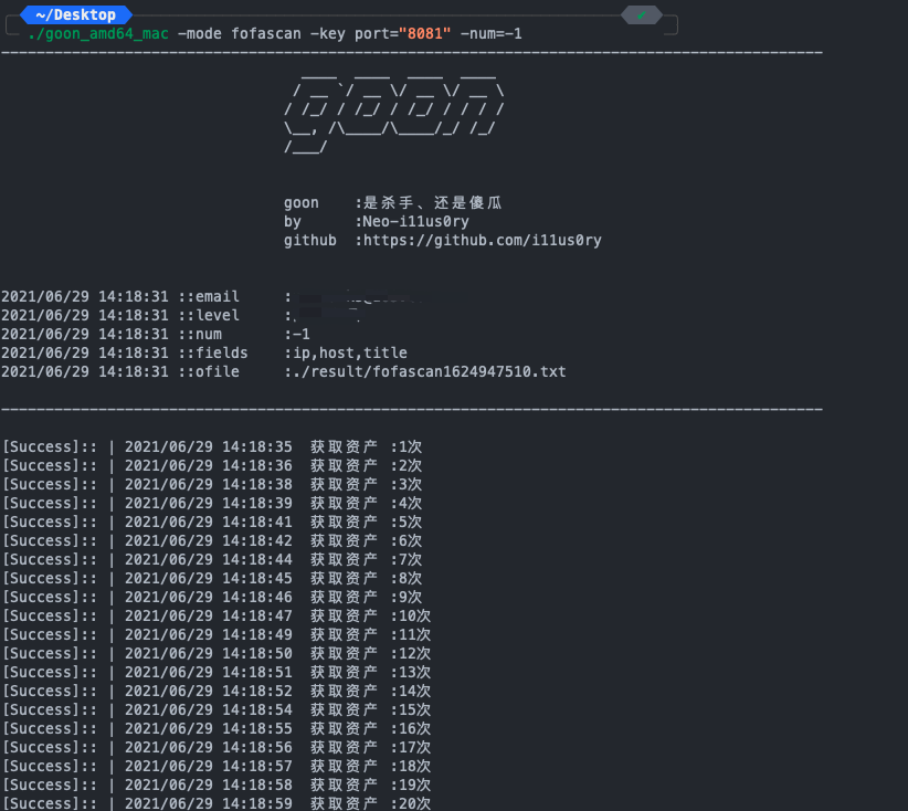 ./goon_amd64_mac -mode fofascan -key port="8081" -num=-14.查看结果
