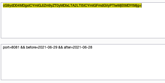 port=8081 && before=2021-06-29 && after=2020-06-30port=8081 && before=2021-06-29 && after=2021-06-28通过设置不同的查询语句,来获取结果,结果中会存在重复的数据。