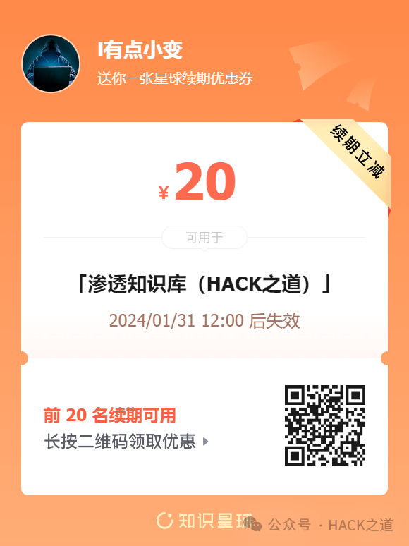 知识星球渗透知识库2022年成绩已持续运营3年多,欢迎师傅们加入分享各种干货资源知识星球渗透知识库(HACK之道)汇集最全、最新的安全知识库,内容不限于红队攻防实战、内网渗透、代码审计、社工、安卓逆向