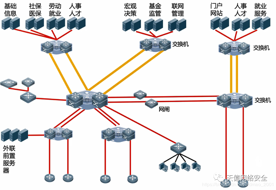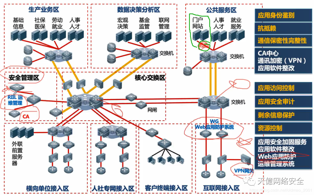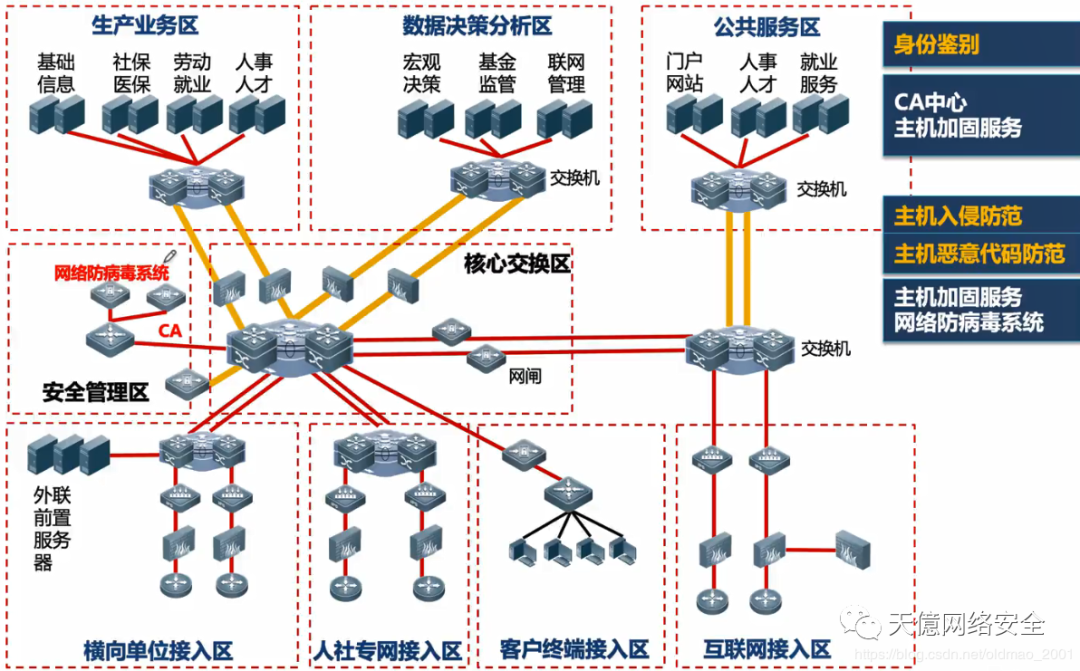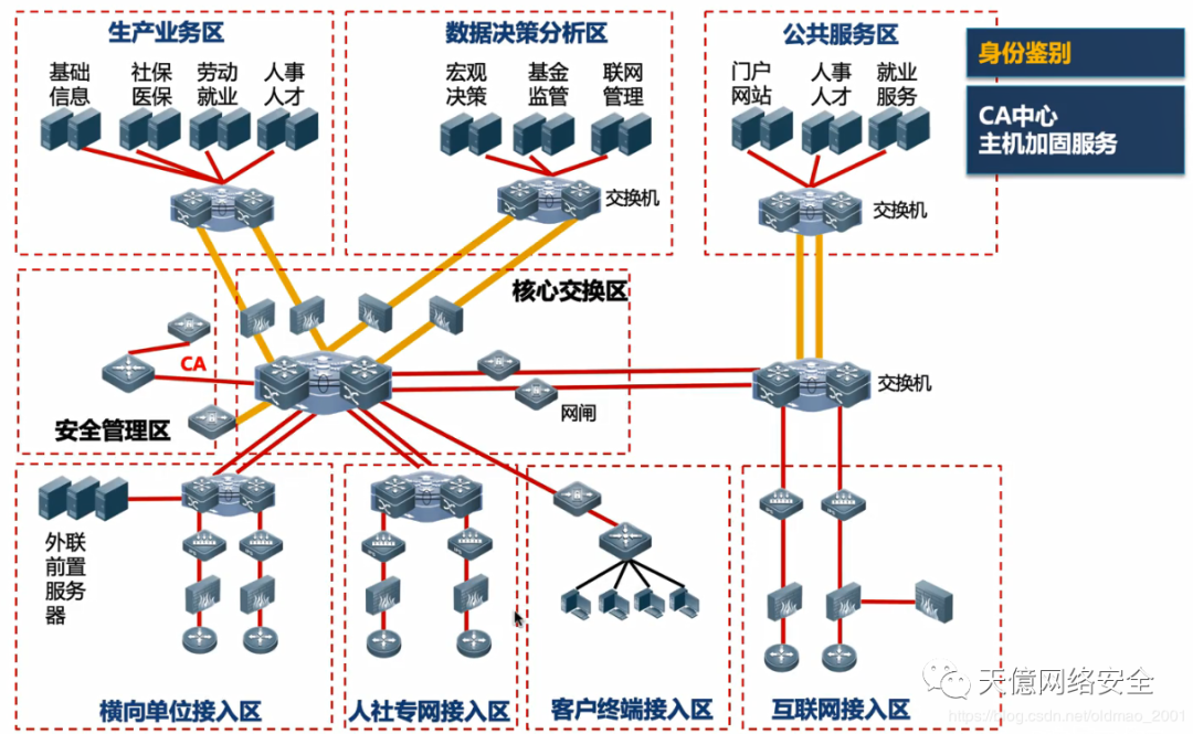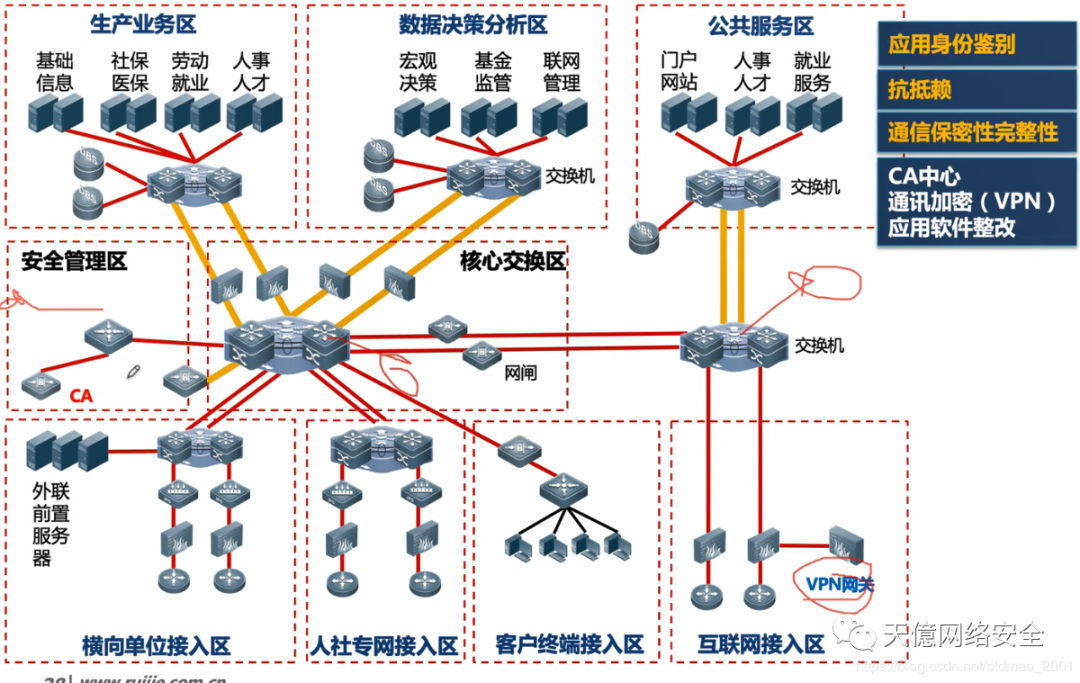 通讯加密(VPN):如下图所示可以挂在互联网接入区,当然也可以挂在安全管理区,或者挂在核心交换区、或右边那个交换机上