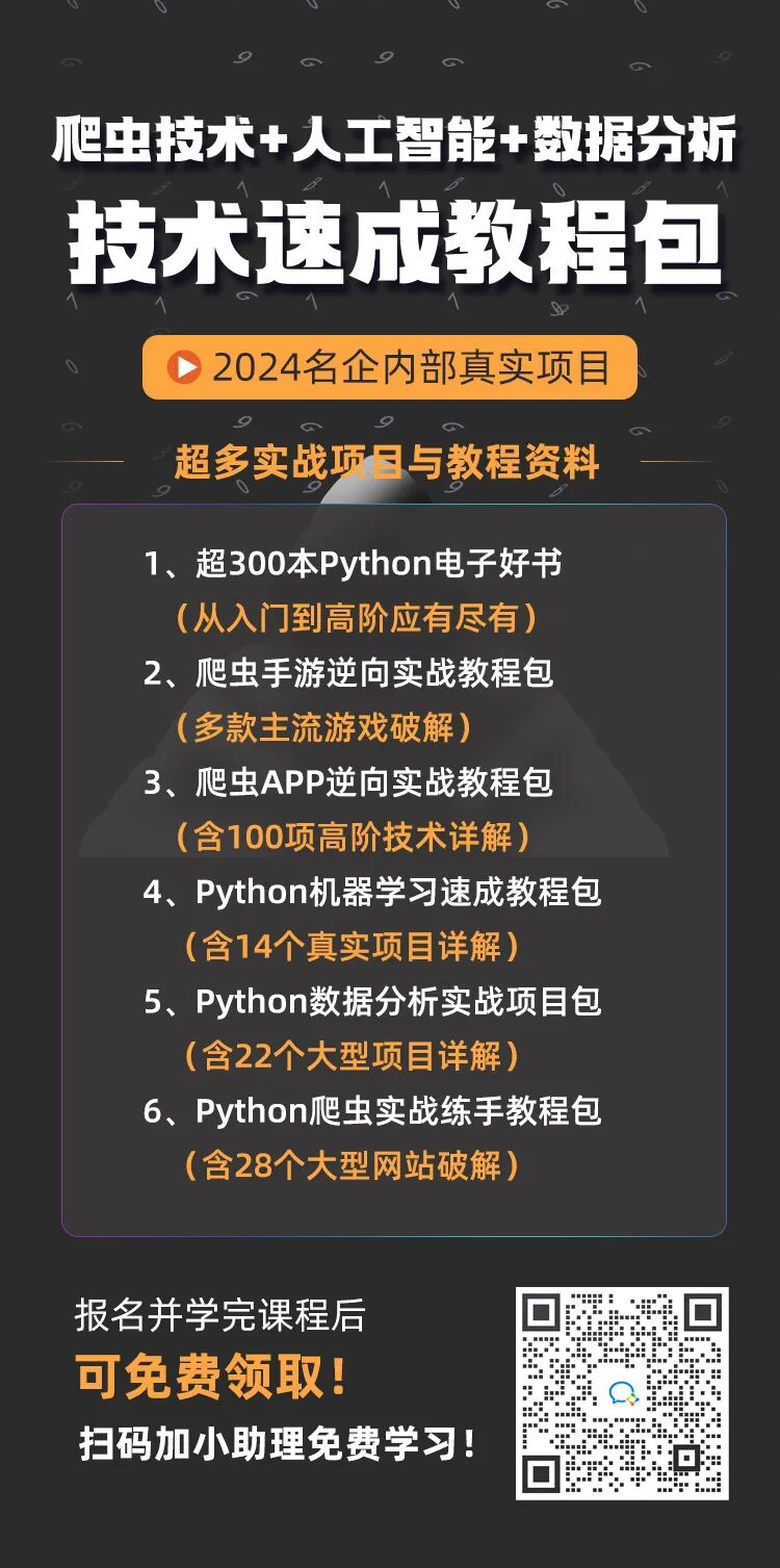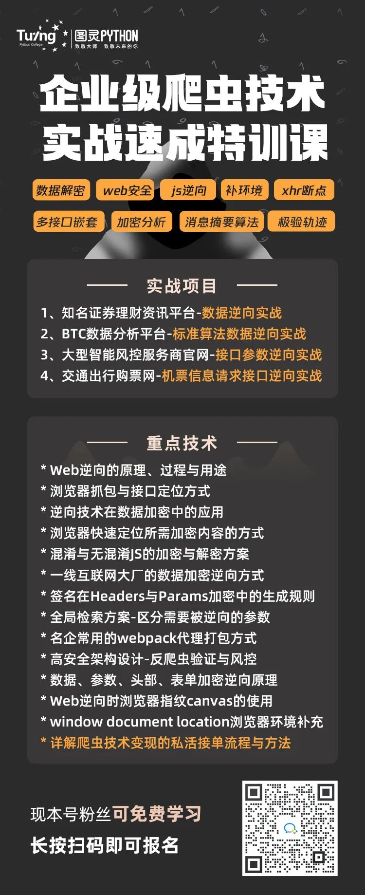 这是一套专讲爬虫逆向破解的高阶技术实战课,迄今为止已帮助超三万学员快速进阶。本次课程将由国际大数据竞赛获奖大佬亲身指导,带领大家进行一线大厂高阶技术体系+多重逆向解析项目实战+技术变现路径指导的综合速成训练!