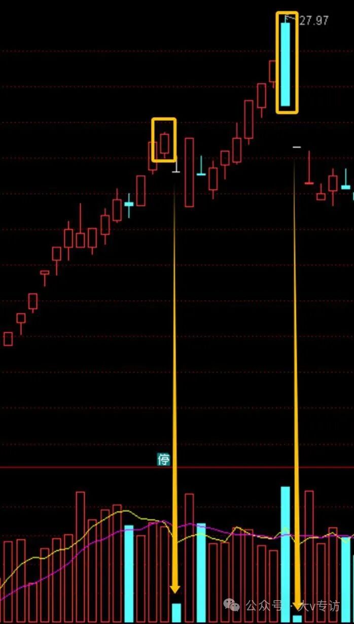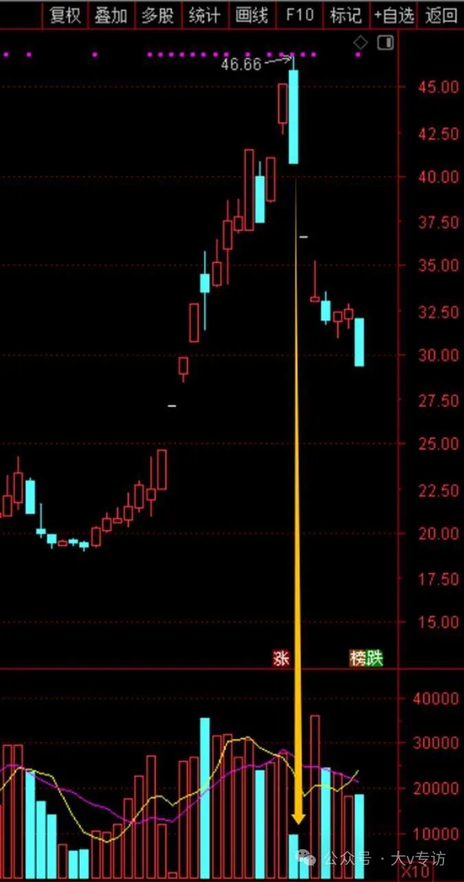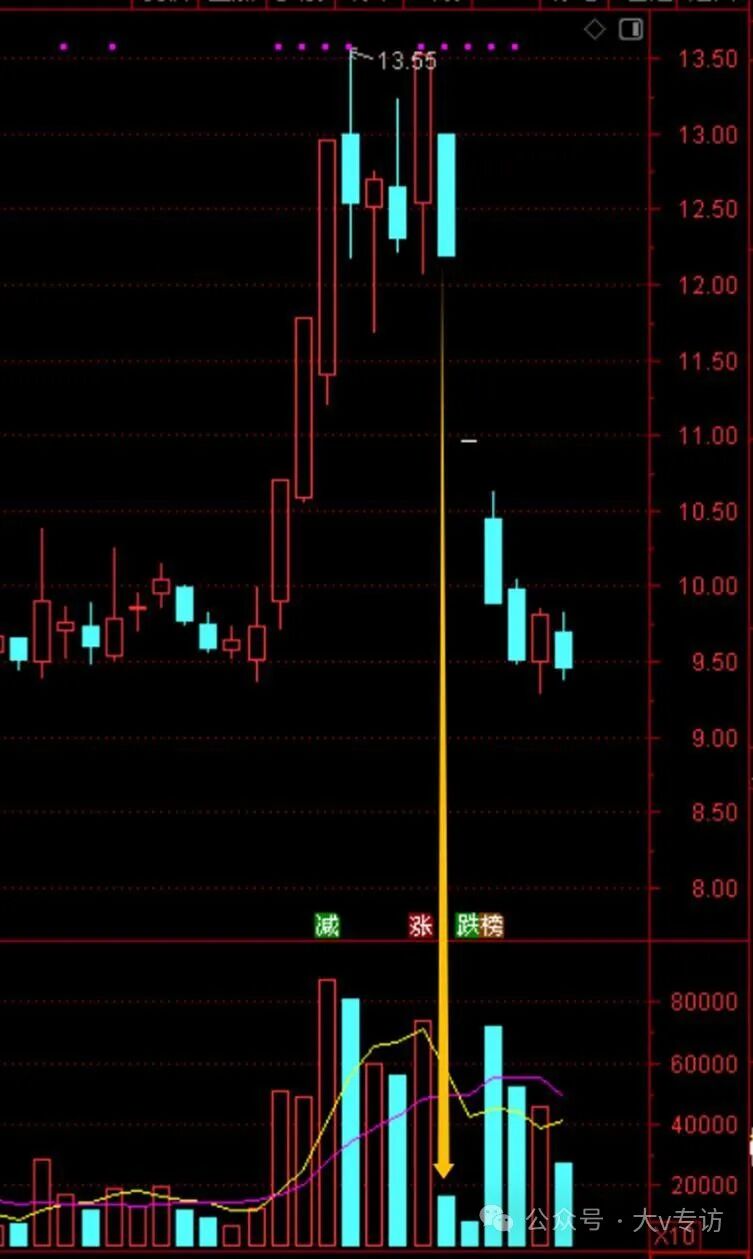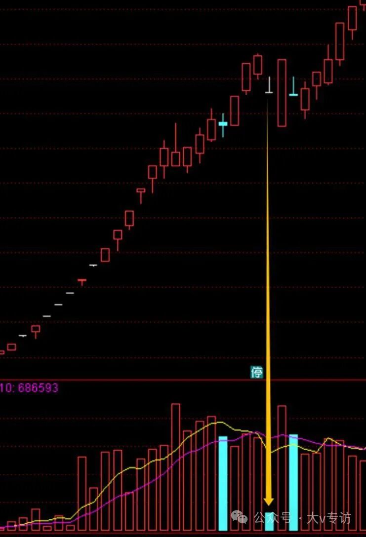 拿近期的威龙股份为例,黄色箭头这天,是阴线,不是一字,但从量能看是符合筹码断层:前一天大涨,次日缩量跌停。第三天继续缩量一字,都没资金来翘板,第四天继续杀。