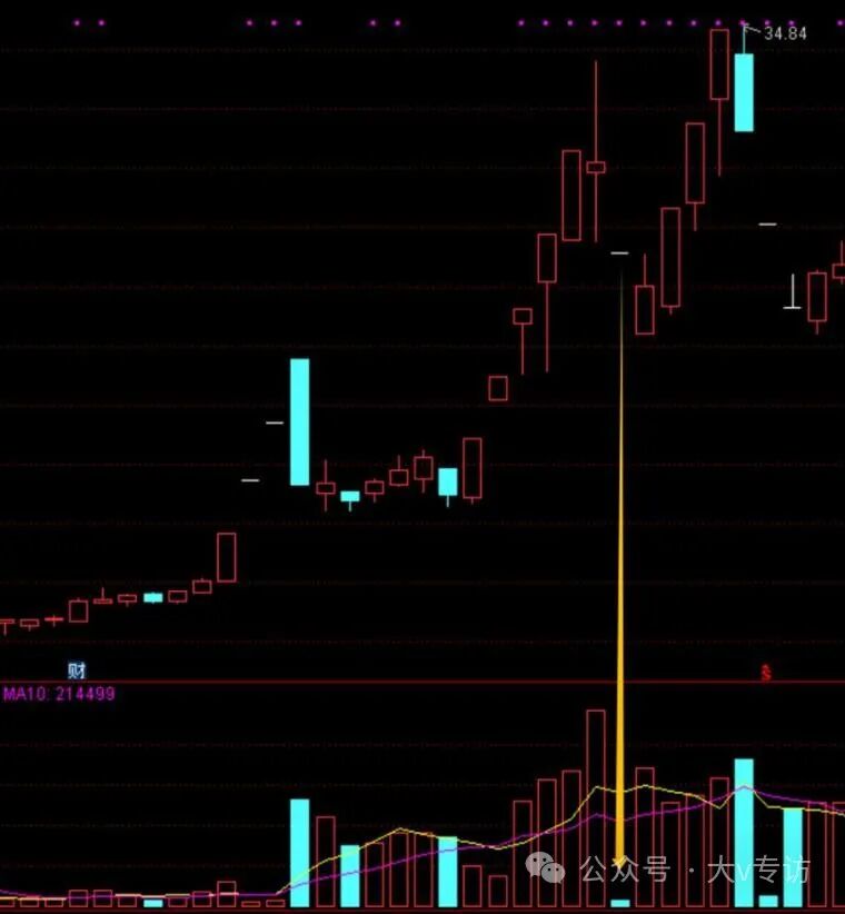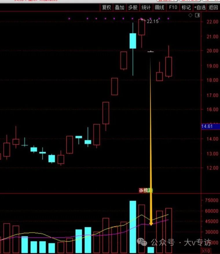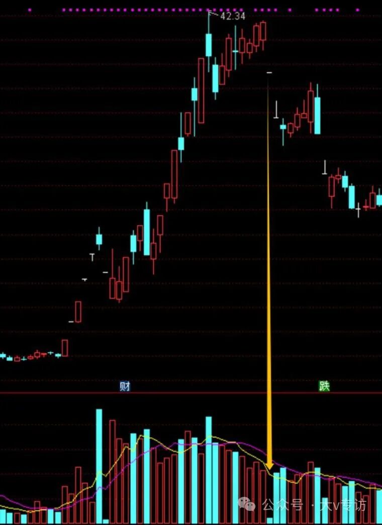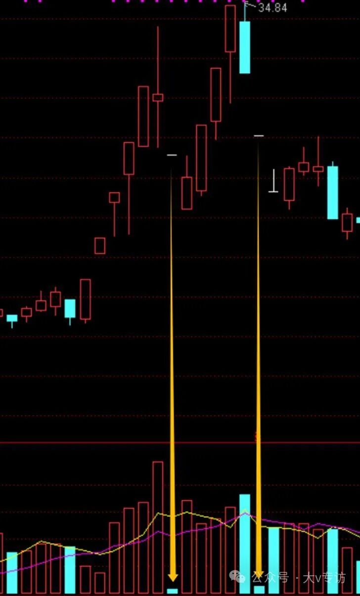 拿近期的威龙股份为例,黄色箭头这天,是阴线,不是一字,但从量能看是符合筹码断层:前一天大涨,次日缩量跌停。第三天继续缩量一字,都没资金来翘板,第四天继续杀。