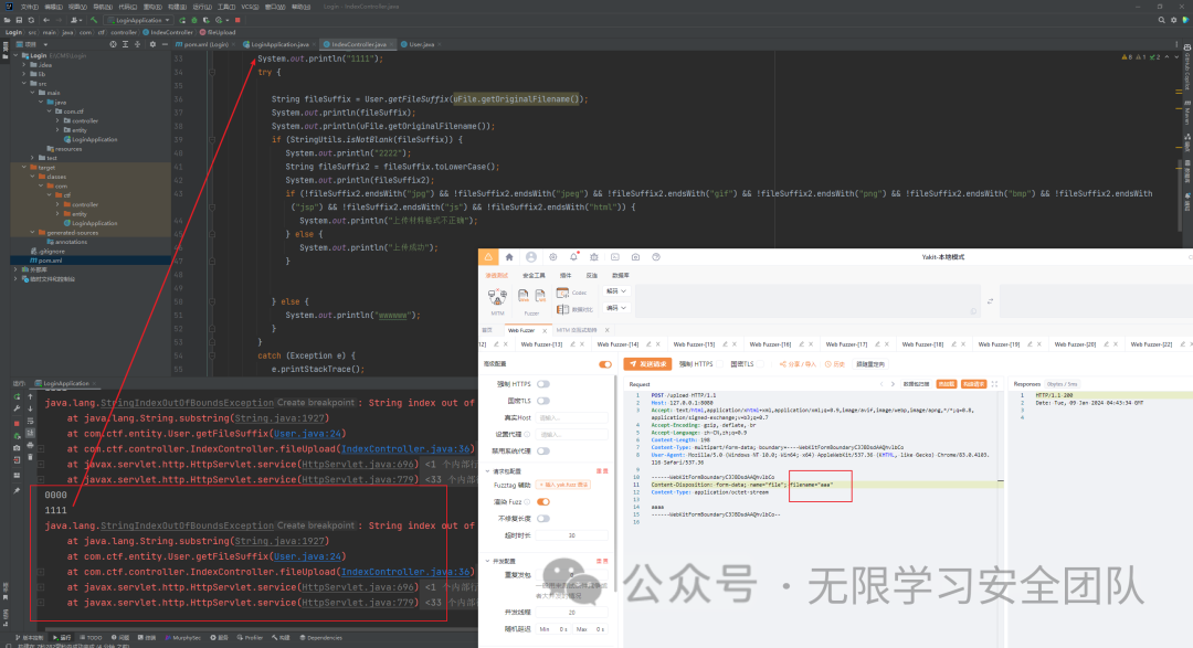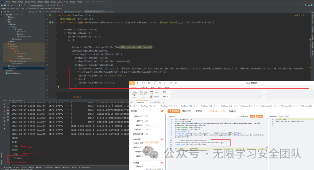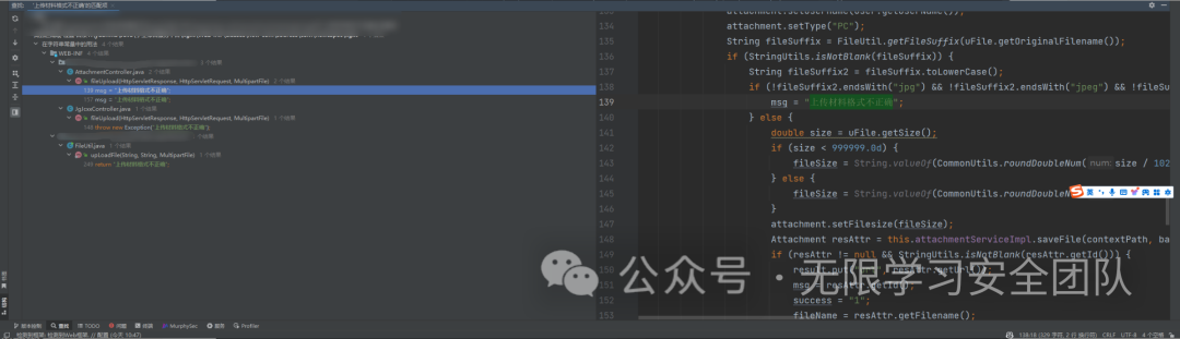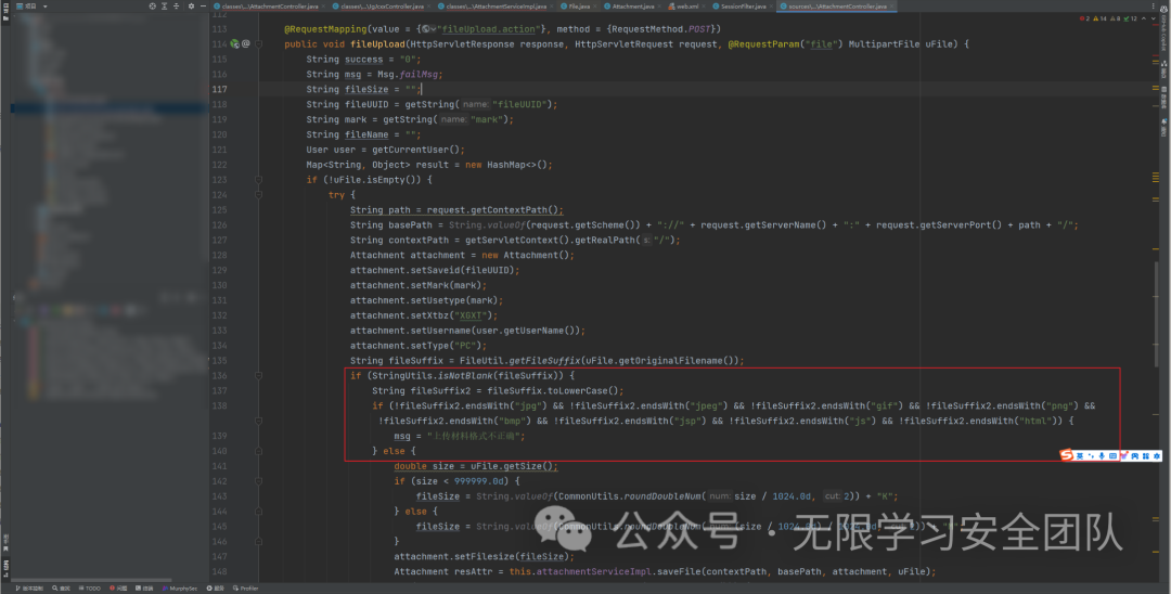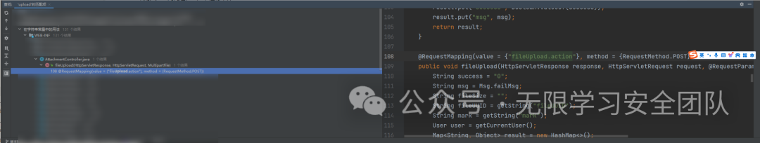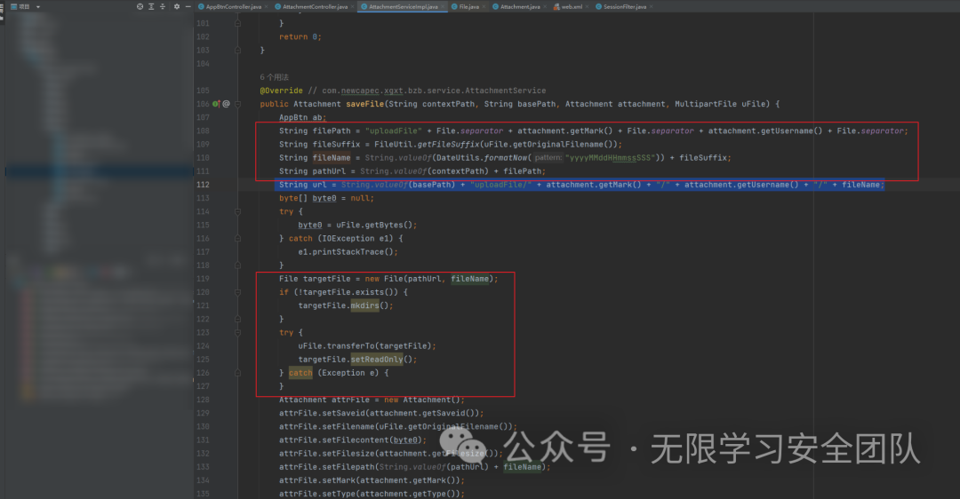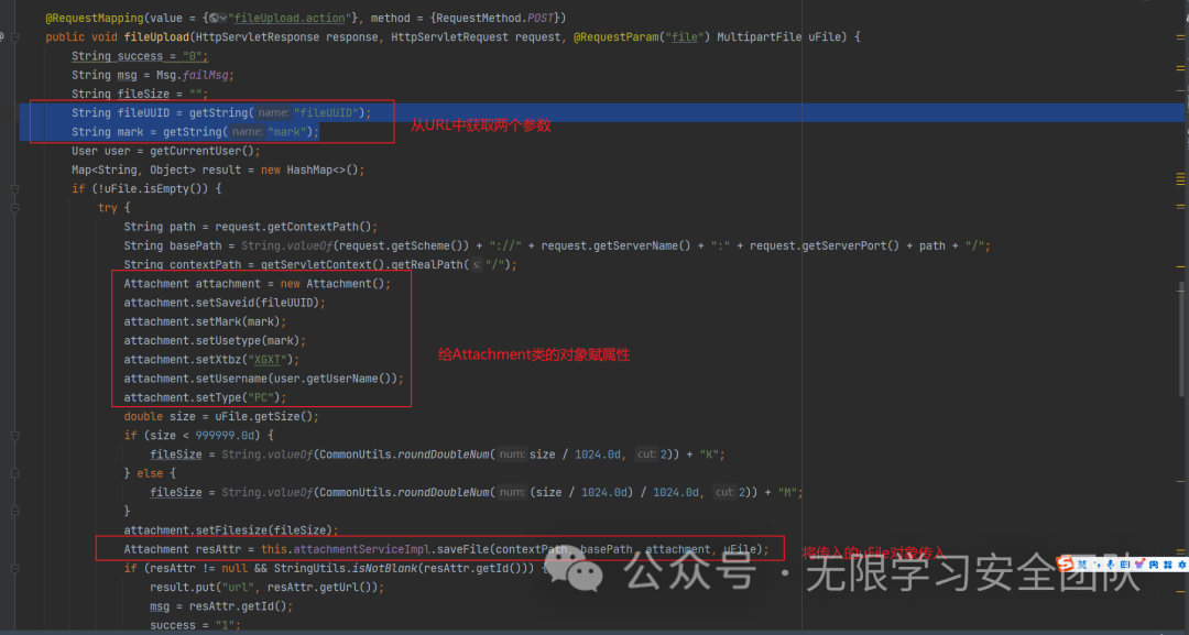upload一个一个找 发现了在这里@RequestMapping({"/attachment/*"})fileUpload.action映射saveFile方法 发现是接口的方法,寻找实现接口的类重写的saveFile方法\service\impl\AttachmentServiceImpl.javaString fileSuffix = FileUtil.getFileSuffix(uFile.getOriginalFilename()); // 直接获取用户上传的文件名后缀String fileName = String.valueOf(DateUtils.formatNow("yyyyMMddHHmmssSSS")) + fileSuffix; // 并且与时间进行拼接String url = String.valueOf(basePath) + "uploadFile/" + attachment.getMark() + "/" + attachment.getUsername() + "/" + fileName; // 生成文件的路径//接着就是真正的将上传的文件写入到一个File对象当中存储byte0 = uFile.getBytes();File targetFile = new File(pathUrl, fileName);uFile.transferTo(targetFile);targetFile.setReadOnly();