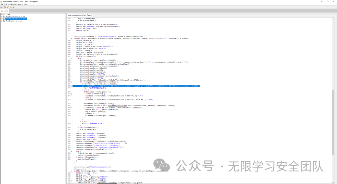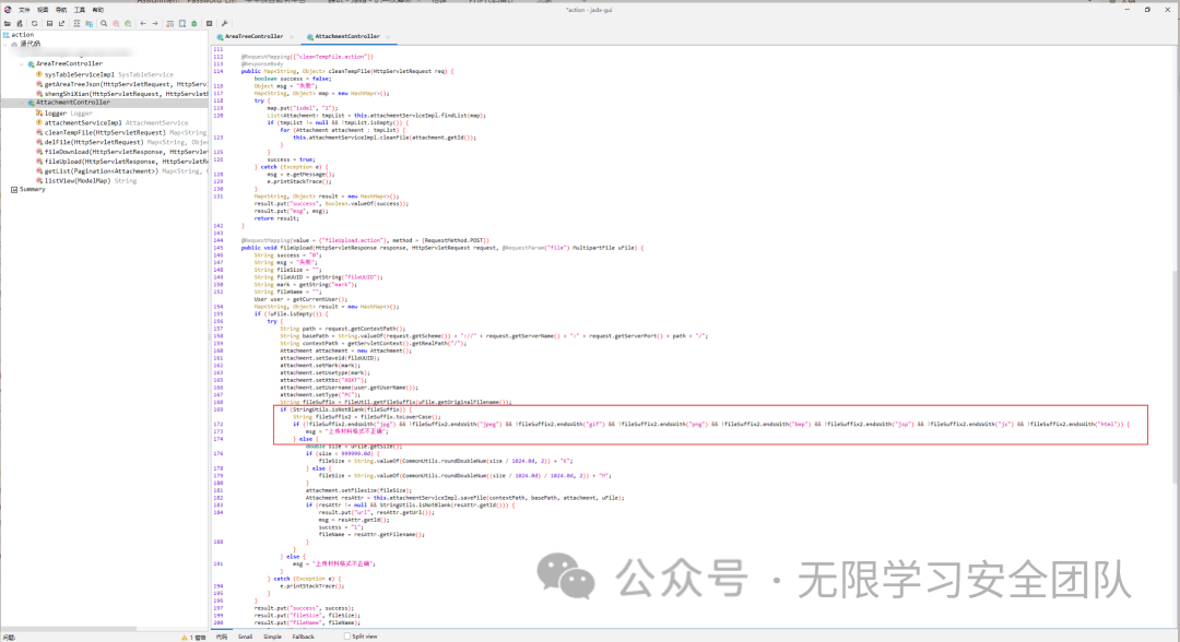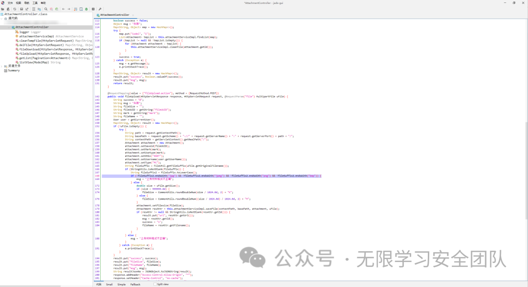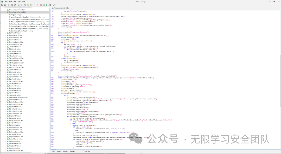 IDEA的反编译 + jd-gui.exe + jadx 三个反编译工具进行演示,以下都关注方法fileUpload内容AttachmentController.classjd-gui.exe 直接打开AttachmentController.class