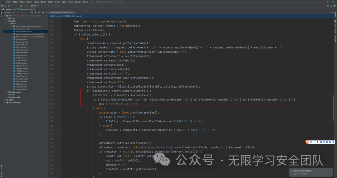 上传材料格式不正确 关键词 ,发现仅仅只有四处存在上传材料格式不正确 发现肯定是能走进去的上传材料格式不正确也不可能 因为根本走不到这里,因为只要后缀名为空就会被catch捕捉到报错而进行报错,并不会因为后缀名为空就进入到这个上传材料格式不正确中.jsp并没有被白名单所匹配到 emmmm。。。存疑?可是我本地没问题啊。。。一样的代码,根本不需要考虑过滤器的原因,如果过滤器这地方拦了就不会显示上传材料格式不正确了,好奇怪Jadx的问题,我发现他针对单文件的反编译是很正常的,但是只要是一个目录下,他就发生了一些错乱,比如 增加莫名其妙的代码或者是反编译错误把别的地方的代码混杂在一起,以下是踩坑记录首先目录结构如下
