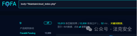 访问:/cretime.txt 文件可查看版本.body="对不起,您的日志系统时间和您的流控系统时间相差超过30分钟,请核对!"body="Maintain/cloud_index.php"body="js/pad-zeropadding.js" && category="日志分析与审计"其余语法自寻研究
