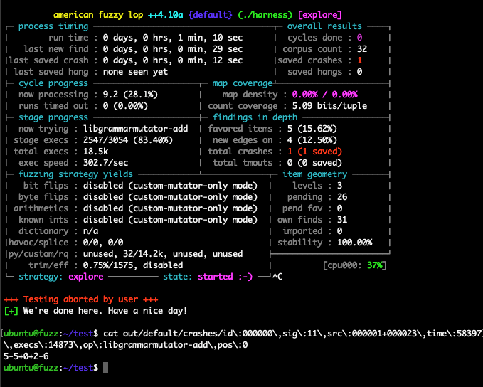 AFL_CUSTOM_MUTATOR_ONLY=1 AFL_CUSTOM_MUTATOR_LIBRARY=./libgrammarmutator-addsub.so ../AFLplusplus/afl-fuzz -i in/ -o out/ -t 1000 ./harness执行如下:
