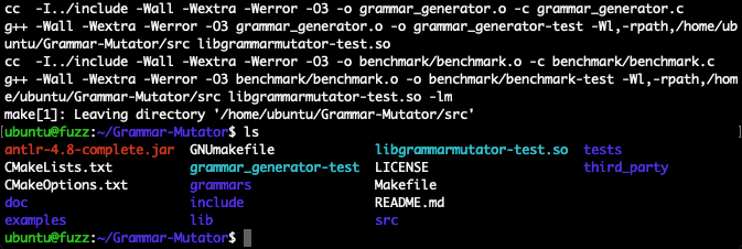 $ make ANTLR_JAR_LOCATION=./antlr-4.8-complete.jar GRAMMAR_FILE=grammars/test.json执行如下,成功编译后将生成 grammar_generator-test 用于生成种子文件,以及 libgrammarmutator-test.so 用于 AFL++ 变异算法插件,如下: