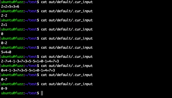 $ ../AFLplusplus/afl-gcc -Wall -O0 ten-addsub.c -o harness # 准备种子文件