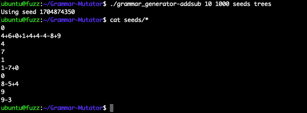 我们可以使用 grammar_generator-test 生成 fuzzing 种子文件,或检查测试语法是否正确: