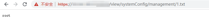 /view/systemConfig/management/1.txt访问写入的文件,发现执行的whoami命令成功回显并输出到1.txt内容中。