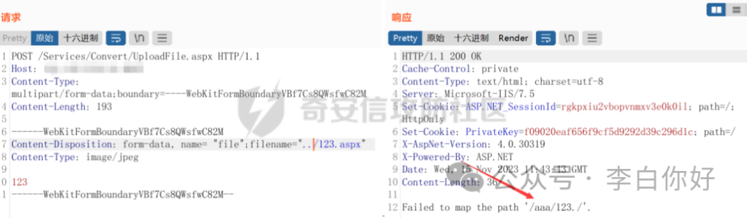 但是在利用的时候发现上传aspx失败,换后缀asp、cer会出现403,于是利用创建文件夹的特性,去创文件夹穿?