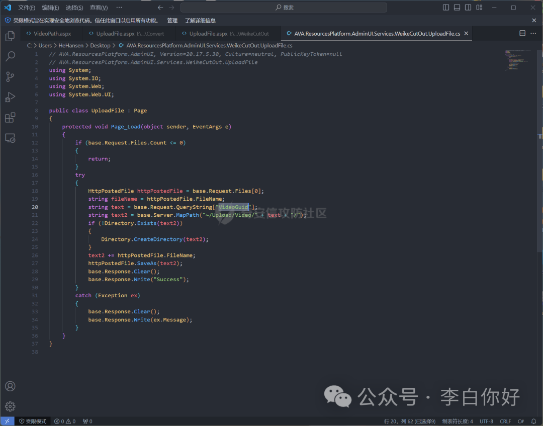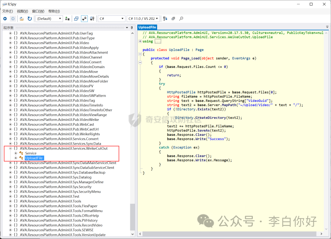 于是直接快速定位了一个 AVA.ResourcesPlatform.AdminUI.Services.WeikeCutOut.UploadFile