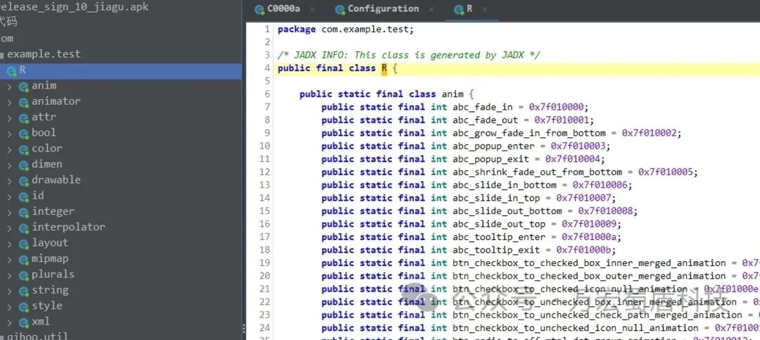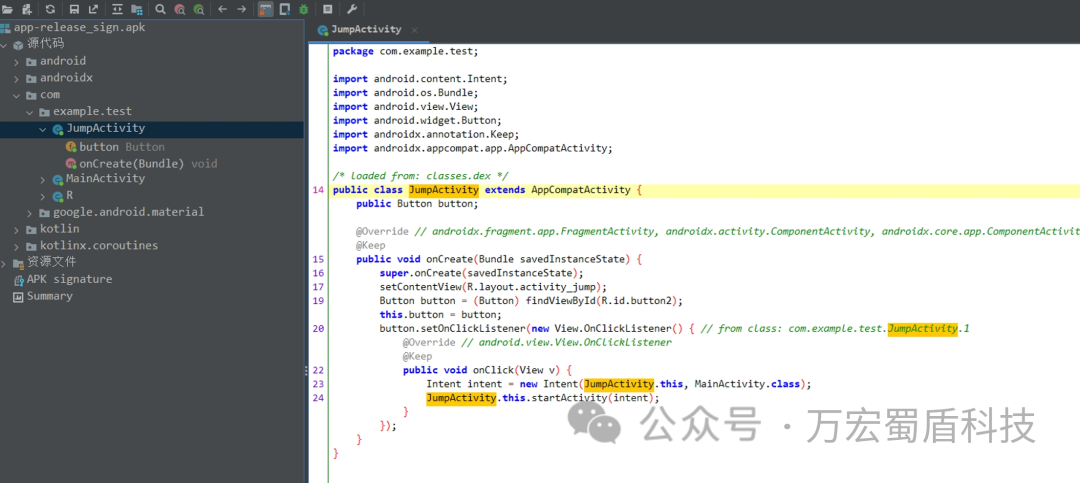 使用360加固助手对打包完成的APK进行签名并重新输出为app-release_sign.apk,使用反编译软件打开打包完成的测试APK app-release_sign.apk,此时反编译结果与源代码一致。