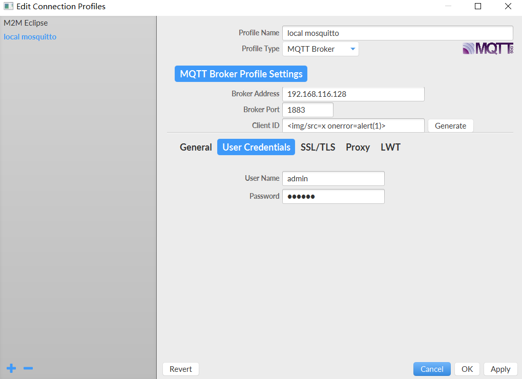 通过连接工具,在连接配置中的clientid中加入xss 攻击载荷<img/src=x onerror=alert(1)>