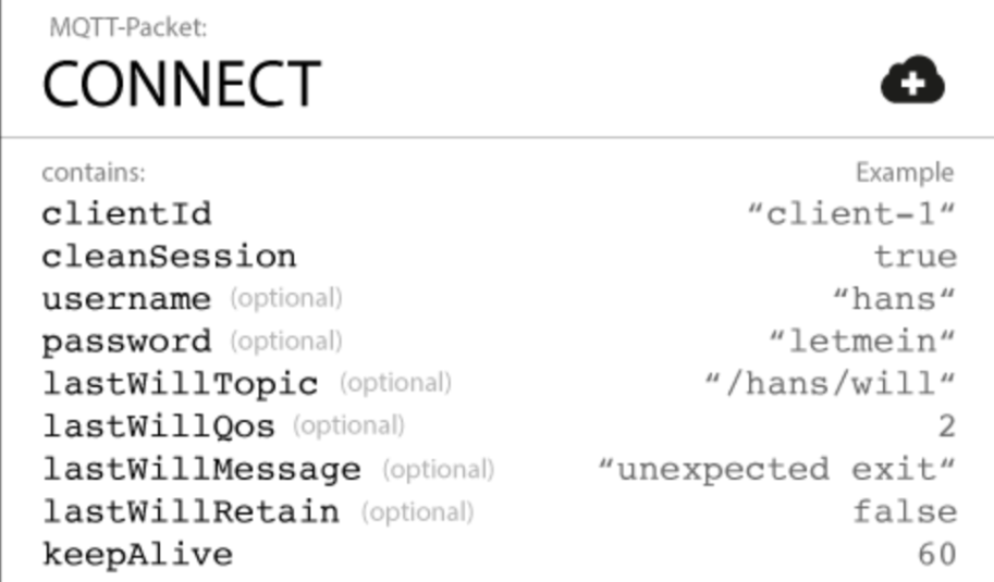 MQTT的数据包都包含上述三个部分,每一种消息类型不同的点在于消息体(payload)的不同,例如: