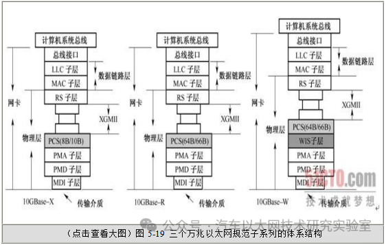 在 2002 年发布的 7 个规范中,可以分为三大类,即 10GBase-X(仅包括 10GBase-X 规范)、10GBase-R(包括 10GBase-SR、10GBase-LR 和 10GBase-ER 三个规范)和 10GBase-W(包括 10GBase-SW、10GBase-LW 和 10GBase-EW 三个规范)。这三个子系列所对应的物理层体系结构分别对应图 5-19 中的左、中、右图(注意其中用颜色标注的部分)。