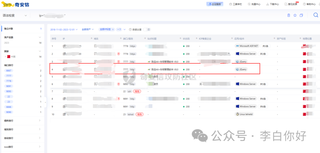 此时在给出的靶标中发现ip地址:xxx.xxx.xxx.xxx;我们针对该ip进行信息收集;通过网络空间安全测绘平台(鹰图平台、360网络空间测绘、FOFA)进行信息收集;此时发现其7777端口开放服务且搭建了一个致远OA系统