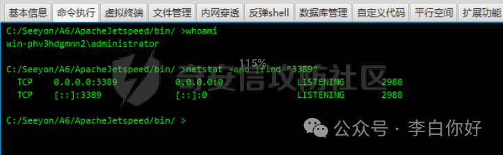 此时发现存在360的杀软进程;那么此时我们就不能贸然的直接上传frp进行内网穿透;可以看看是否开启3389端口