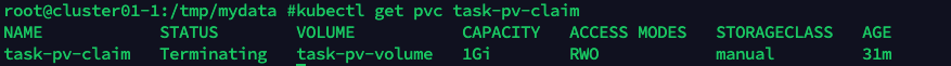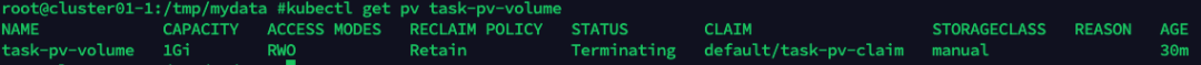 查看该 PV,你可以看到 PV 的状态为 Terminating ,这是因为和该 PV 绑定的 PVC 还未删除,因此 PV 对象此时处于被保护状态的。然后删除 PVC。