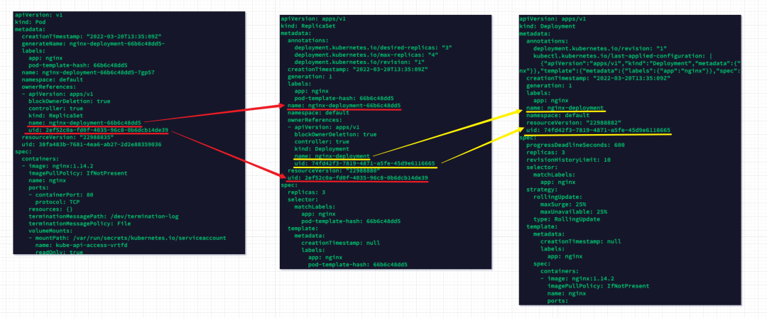 如下图所示,从左到右依次是 Pod, ReplicaSet, Deployment 的资源详情: