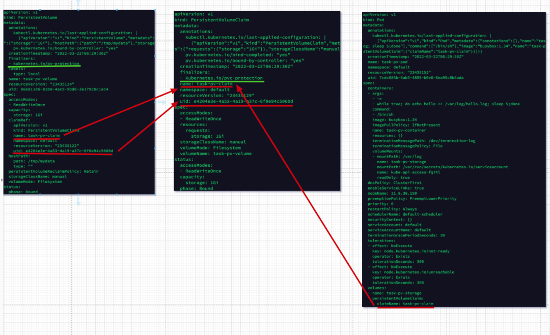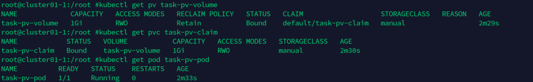 如下图所示,从左到右依次是 PV, PVC, Pod 的资源详情: