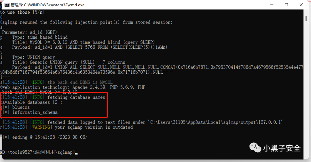 输入:python sqlmap.py -u 注入点地址 -p 注入点 --dbs