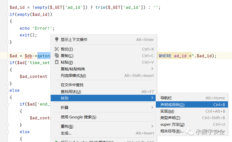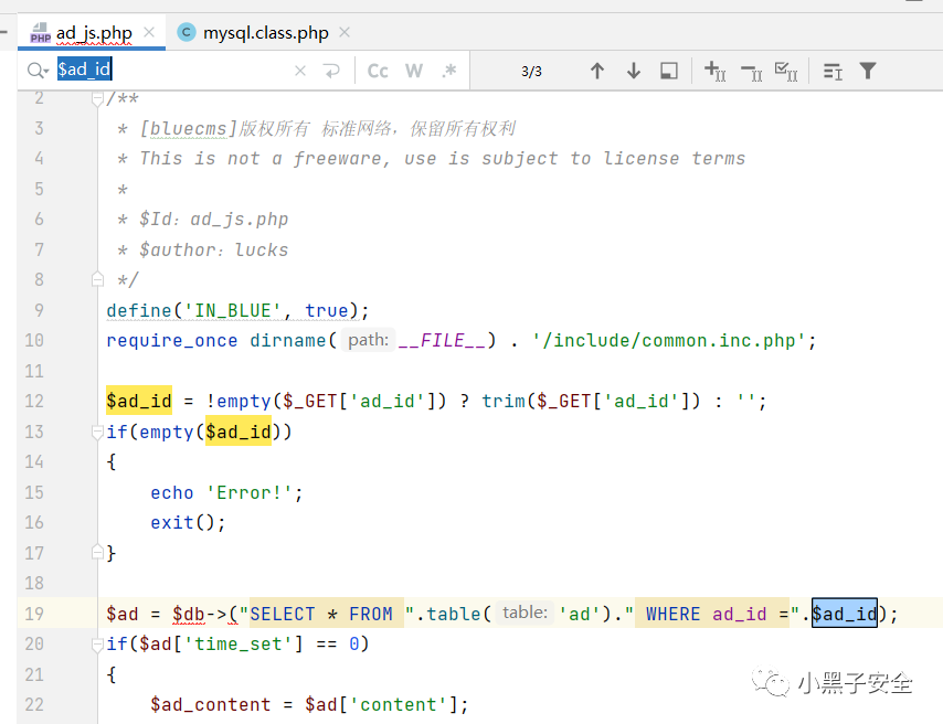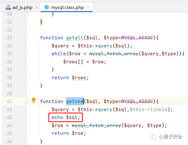 8.到getone函数声明处将sql语句输出,看看$ad_id变量是否和代码中表现的一样可控