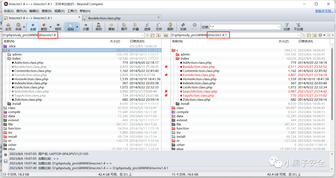 打开工具,选择文件夹对比,拖入两个版本的cms。有颜色标识的就是更新后作出过更改的文件