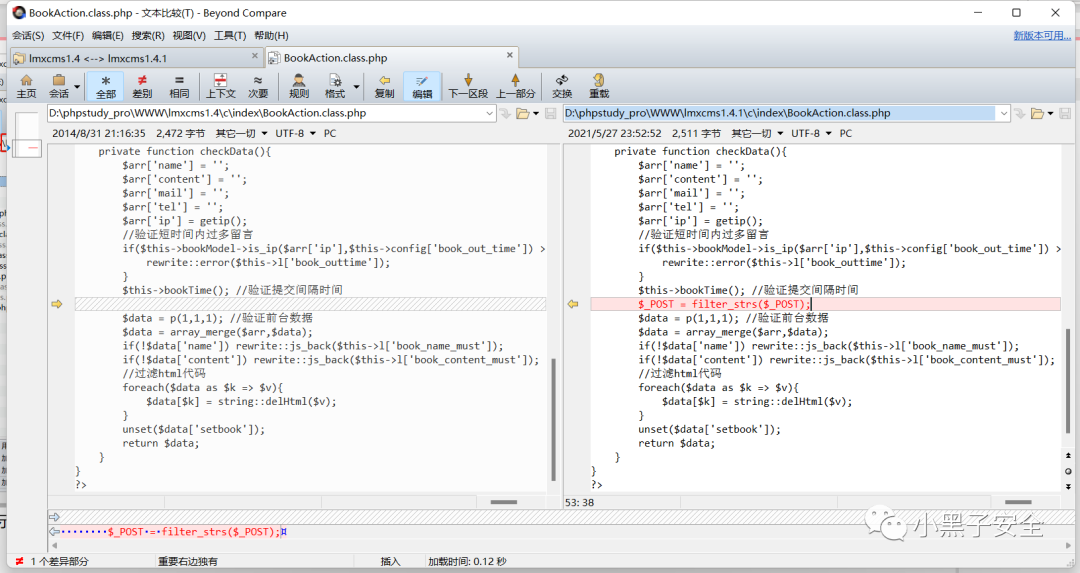 打开有颜色表示的文件,可以看到更新后修改代码的情况。我们就可以根据代码的修改情况确认漏洞的产生位置。