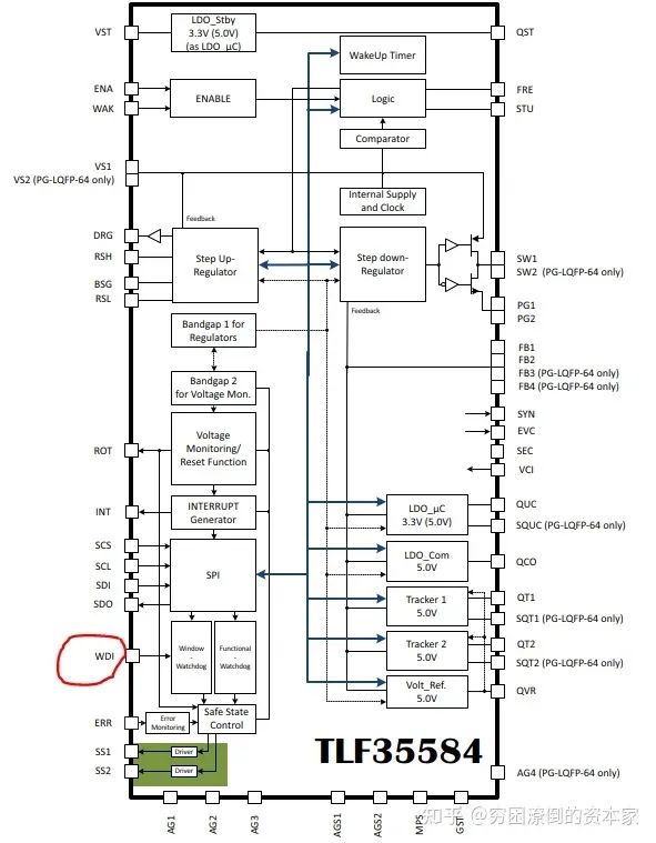 以汽车产品中最通用的英飞凌的TLF35584芯片为例,该电源管理芯片通过了ISO26262的ASILD的认证,并且集成了看门狗模块,该看门狗模块既属于硬件看门狗,同时也属于外部看门狗。由Window Watchdog和Functional Watchdog组成,(后面简化成为WWD和FWD)