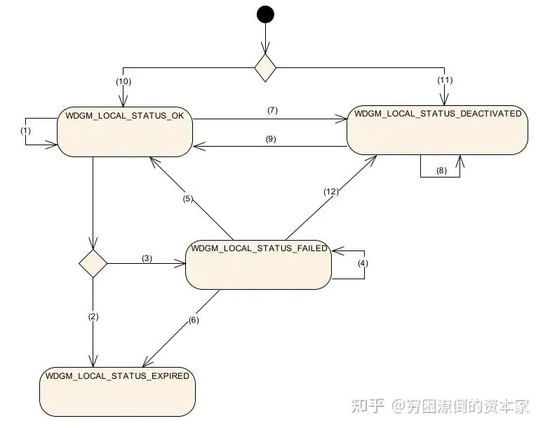 一个Supervised Entity可以同时设置多种Supervision机制,基于每一种机制返回的状态,可以计算出当前Supervised Entity的状态,也即Local Status。 当每一个Supervised Entity的状态都得到的时候,就能计算出整个MCU的状态了,也即Global Supervision Status。每一种Supervision功能都会返回状态列表,代表正确或者不正确,最后对于每一个Supervised Entity来说会有三个状态,Alive Supervision状态,Deadline Supervision状态,Logical Supervision状态。然后计算出本地状态,也即绿色框所示。最后是红色框所示的全局状态。 执行WdgM_CheckpointReached()函数,会更新Deadline Supervision和Logical Supervison的状态,执行WdgM_Mainfunction()更新Alive Supevision的状态。