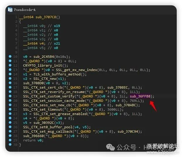 function onLoad(name, callback) {//void* android_dlopen_ext(const char* filename, int flag, const android_dlextinfo* extinfo);//原型const android_dlopen_ext = Module.findExportByName(null, "android_dlopen_ext");if (android_dlopen_ext != null) {Interceptor.attach(android_dlopen_ext, {onEnter: function (args) {if (args[0].readCString().indexOf(name) !== -1) {this.hook = true;}},onLeave: function (retval) {if (this.hook) {callback();}}});}}onLoad(soName, () => {let SSL_CTX_set_custom_verify = Module.getExportByName('libsscronet.so', 'SSL_CTX_set_custom_verify');if (SSL_CTX_set_custom_verify != null) {Interceptor.attach(SSL_CTX_set_custom_verify, {onEnter: function (args) {Interceptor.attach(args[2], {onLeave: function (retval) {if (retval > 0x0) retval.replace(0x0);}});}});}});