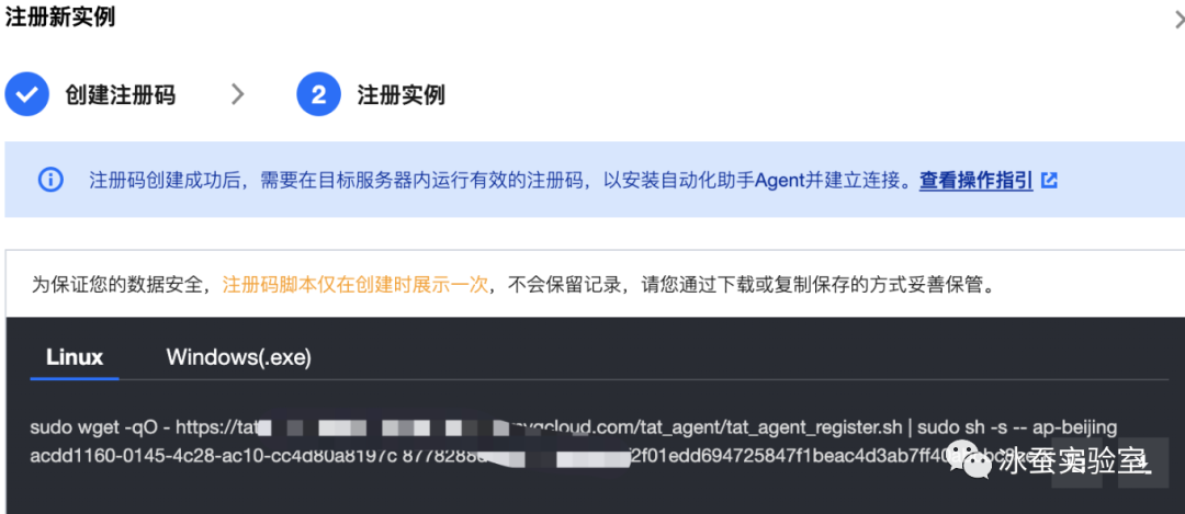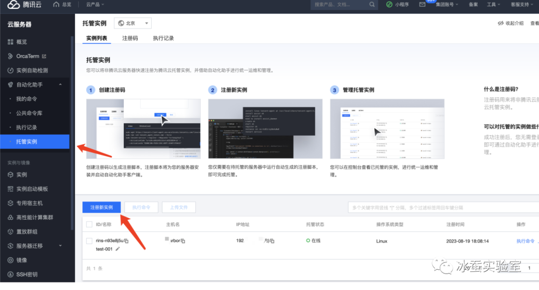 如果这里还没有实例,会显示一个创建注册码的提示,因为我已经创建了,所以会显示已经添加的实例,如果需要继续添加,可以点击“注册新实例”。