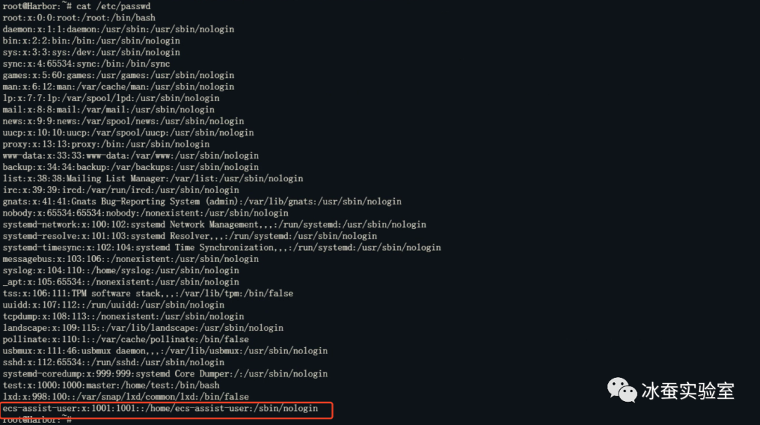其次,阿里云安全中心agent可以从系统添加的用户排查。当安装了云助手时,系统默认添加用户ecs-assist-user,通过查看/etc/passwd进行排查