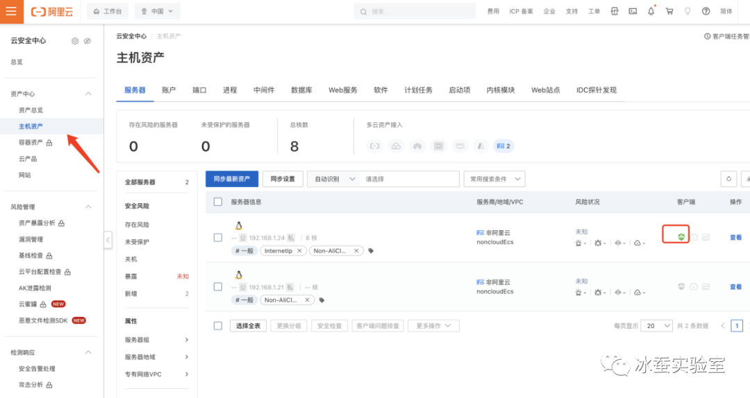 安装成功后,在云安全中心-主机资产处会显示客户端