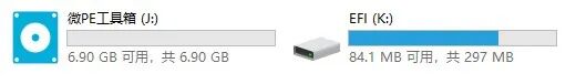 到这里,整个PE系统U盘就制作完成,制作完成后将会出现两个盘,但不要删掉一个名为“EFI”U盘里面的文件(下图示右边的U盘),不然会把PE系统删掉。