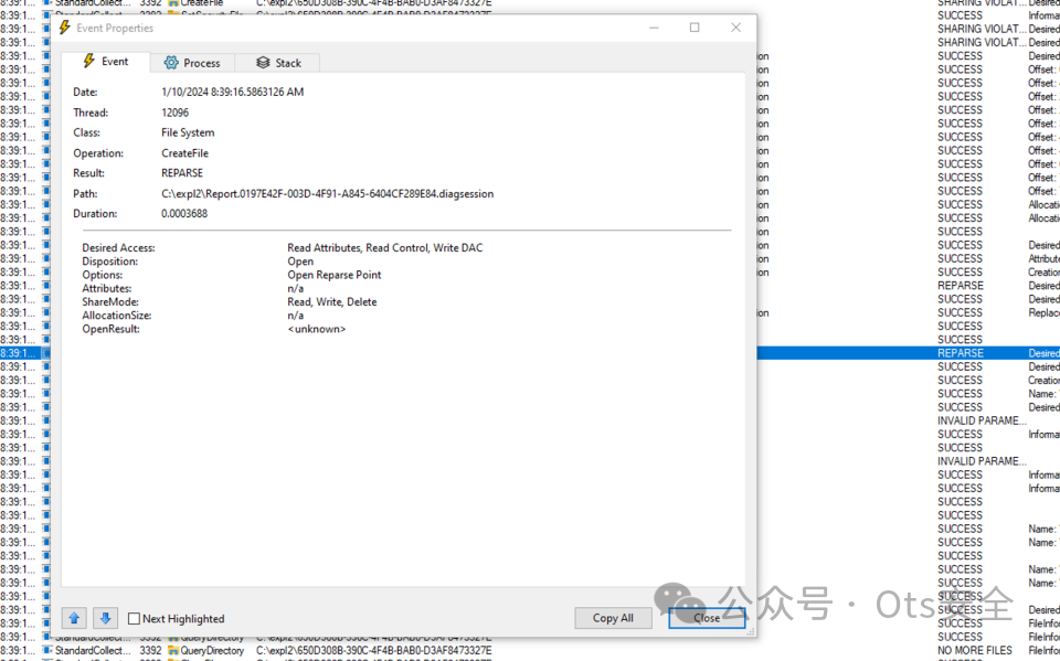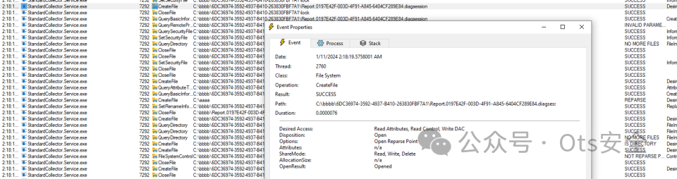 CreateFile如果我们在 procmon 中看到蓝色标记线,我们可以在通过我们的连接点时看到该服务,因为api 调用的结果是REPARSE,并且我们确认可以将其重定向到系统上的任何文件。