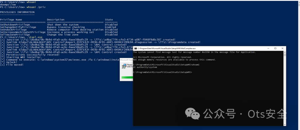 在我们的例子中,我们可以使用任意文件 dacl 重置漏洞来控制 WER 目录,将其定向到我们的连接点,创建一个对象管理器符号链接,这将允许我们创建任意目录(在我创建的第一个 PoC 中,它是msiexec.exe.local 目录),将combase.dll放入其中并将其加载到MSIServer服务中。