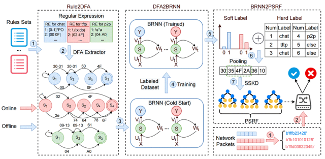 Metis首先将RE规则转换成一系列的有限状态机(Deterministic finite automaton, DFA),并根据这些DFA训练出比特水平的RNN( Byte-level RNNs, BRNN),在模型设计上,将已有的基于RE的专家知识融合到BRNN中,解决了一般RNN的”冷启动“问题,并且随着标签数据量的提升,BRNN的准确性会不断提升。BRNN虽然可以进行网络包的分类,但是模型比较重,占用计算资源较大,无法直接部署到网络转发设备中。为了适配网络设备资源紧缺的特点,我们利用知识蒸馏(Knowledge distillation, KN)技术,将BRNN转换为了Pooling soft random forests (PSRFs)模型。该模型继承了BRNN的训练效果,可取得近似的分类性能,但资源占用却会大大降低,使得AI模型可以部署到资源紧缺型的网络设备中。实验结果表明,使用PSRF模型在可编程交换机上对网络包进行分类时,可以取得相对于使用正则匹配74倍之多的吞吐量。