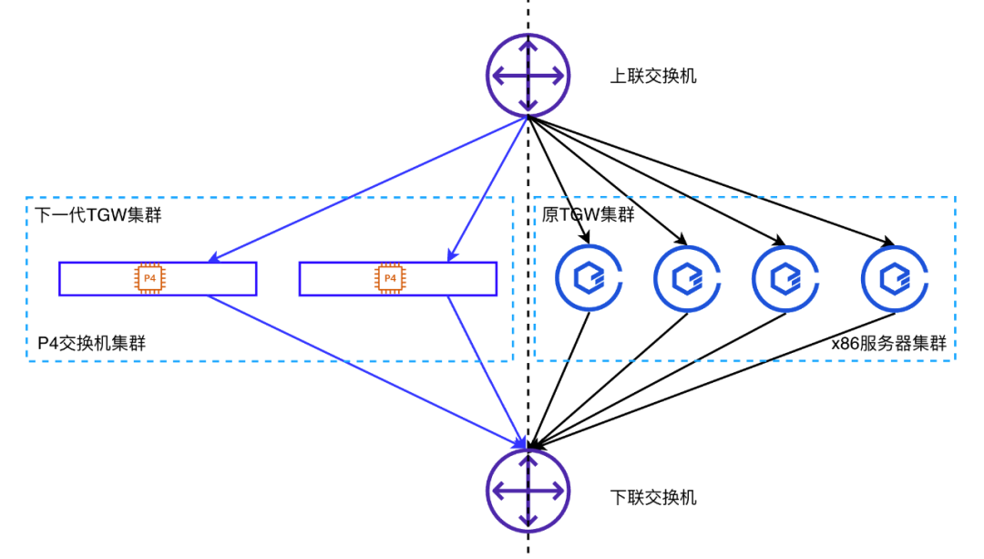 随着5G的应用发展,高带宽低延迟的诉求会越来越强烈,网关设备作为流量汇聚点,更能深刻感受到这种压力。发展了近十年的CPU+DPDK模式,在性能和成本双重压力下,也面临越来越大的挑战。我们结合TGW业务需求,经过技术调研,最后采用了P4+Tofino芯片(TF芯片)可编程交换机作为TGW的下一代网关。
